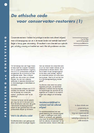 | Samenvatting | Conservator-restorers hebben het privilege te werken met cultureel erfgoed, maar als beroepsgroep zijn ze in de meeste landen niet wettelijk beschermd. België is hierop geen uitzondering. Dit resulteert in een diversiteit aan opleidingen, scholing, ervaring en kwaliteit van werk. Met alle problemen van dien.