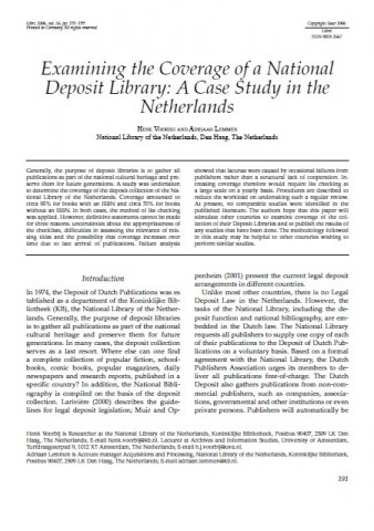 | Samenvatting | Generally, the purpose of deposit libraries is to gather all publications as part of the national cultural heritage and preserve them for future generations. A study was undertaken to determine the coverage of the deposit collection of the National Library of the Netherlands. Coverage amounted to circa 95% for books with an ISBN and circa 70% for books with out an ISBN. In both cases, the method of list checking was applied. However, definitive statements cannot be made for three reasons: uncertainties about the appropriateness of the checklists, difficulties in assessing the relevance of missing titles and the possibility that coverage increases over time due to late arrival of publications. Failure analysis showed that lacunae were caused by occasional failures from publishers rather than a structural lack of cooperation. Increasing coverage therefore would require listchecking at a large scale on a yearly basis. Procedures are described to reduce the workload on undertaking such a regular review. At present, no comparable studies were identified in the published literature. The authors hope that this paper will stimulate other countries to examine coverage of the collection of their Deposit Libraries and to publish the results of any studies that have been done. The methodology followed in this study may be helpful to other countries wishing to perform similar studies.